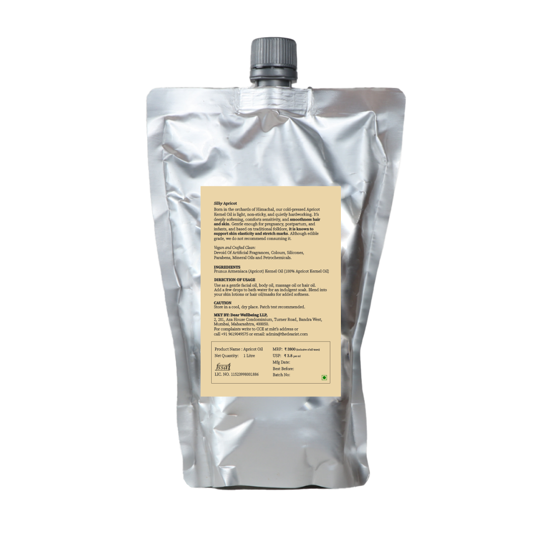 Sourced from apricot kernels grown in the cooler regions of Himachal Pradesh, Dearist Apricot Kernel Oil is cold-pressed to preserve its natural goodness. It is light, fast-absorbing, and deeply nourishing, an everyday oil that respects skin, hair, and even the most delicate bodies. Gentle enough for pregnancy, postpartum, and infants, and based on traditional folklore, it is known to support skin elasticity and stretch marks. Although edible grade, we do not recommend consuming it.